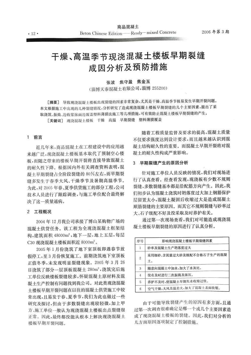 干燥、高温季节现浇混凝土楼板早期裂缝成因分析及预防措施《商品砼》